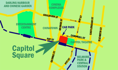 Located in Campbell Street right beside Capitol Square's Hotel and eat street of restaurants - next door to the Capitol Theatre. Direct access to lift from all levels for disabled users.